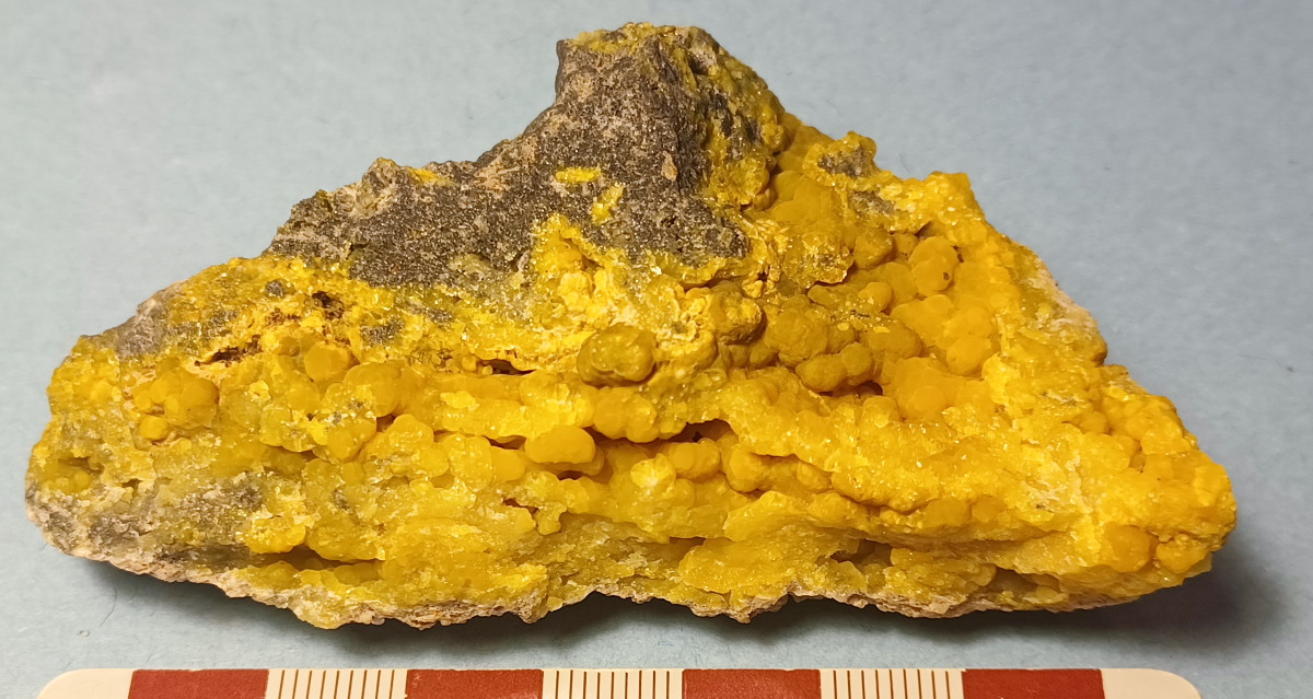 Fig. 1: Cadmium-rich smithsonite from the Sheshodonnell East mine, Carran, The Burren, county Clare, Munster, western Ireland. 6.6x4.3x2.2 cm, 120.55 grams. The sample has a distinctive heft for its size, even allowing for the nominal specific gravity of 4.2 for smithsonite. Cadmium (Cd) is the colouring agent that imparts the spectacular yellow hue. Cadmium may be found at percent levels in sphalerite (ZnS) from some localities, and the smithsonite is possibly a secondary mineral formed from pre-existing zinc sulphide (?). Sample 365, from the collection of Irish minerals of Robert Yeoman, via David and Daniel Joyce (D. Joyce Minerals), 2026.